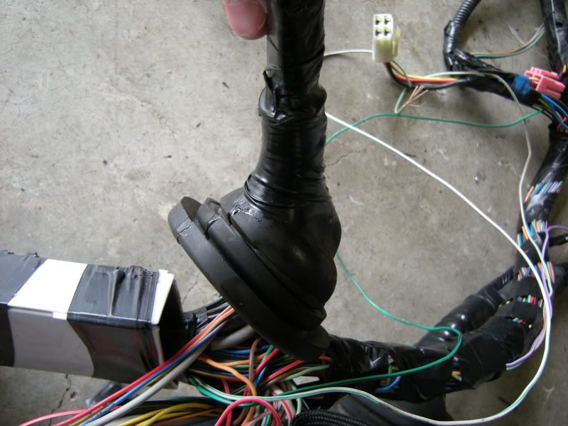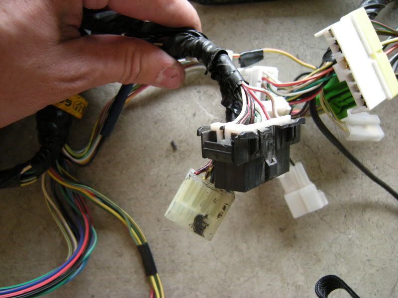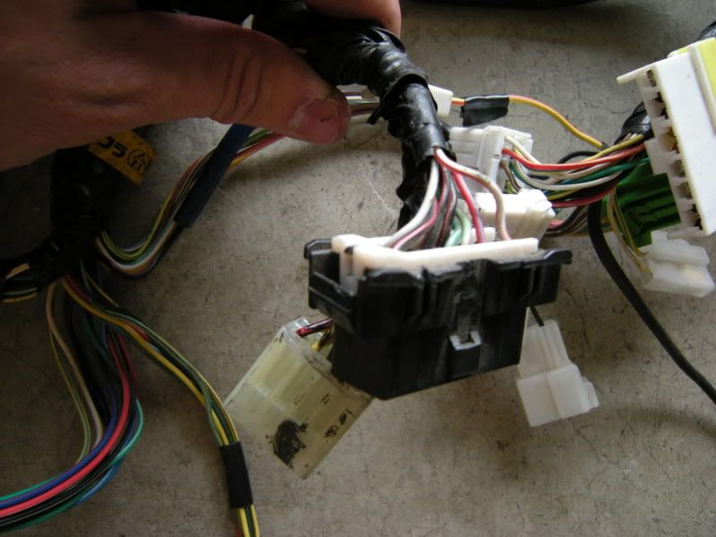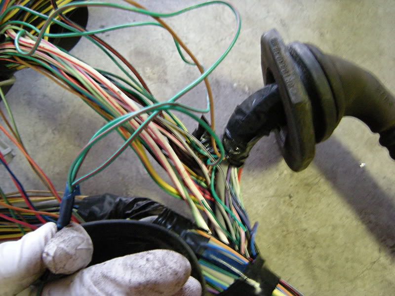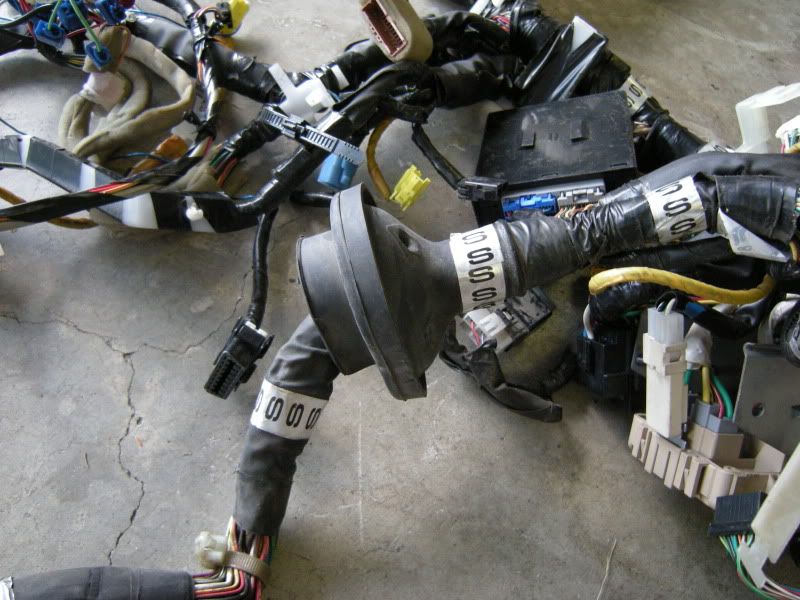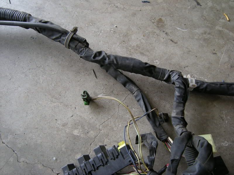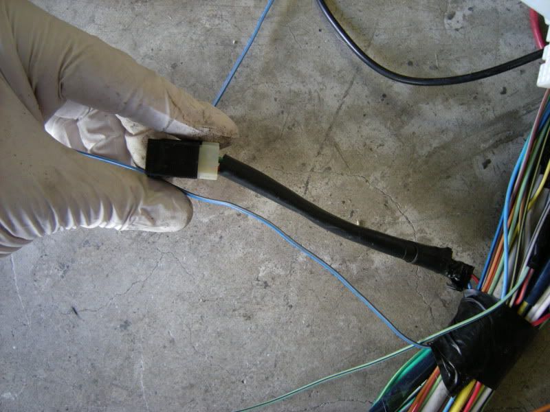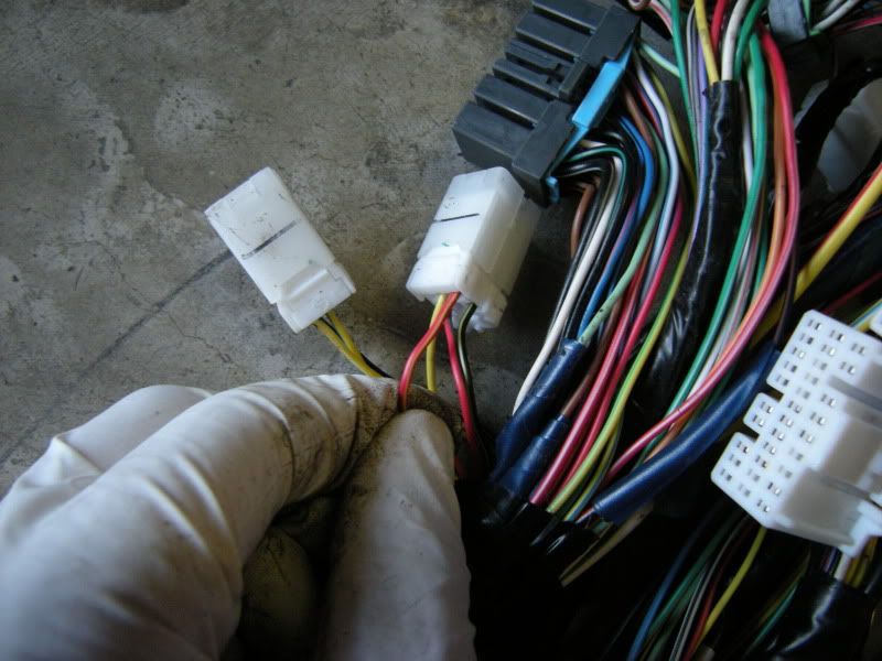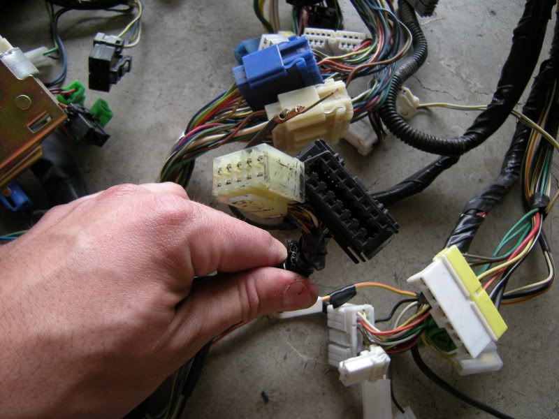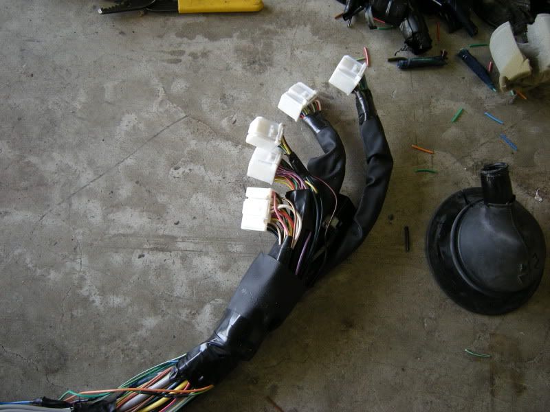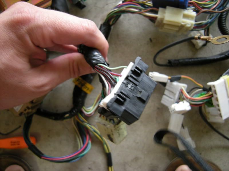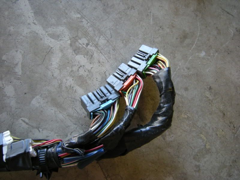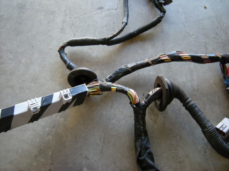 In the center of the bulkhead harness you will find this grommet. There are only a few wires that matter in it but this connection goes to the tranny for neutral switch, backup lights, and rear o2 sensor. Depending on what you are swapping, you may need all or just one of these plugs. This will be discussed when we start cutting.