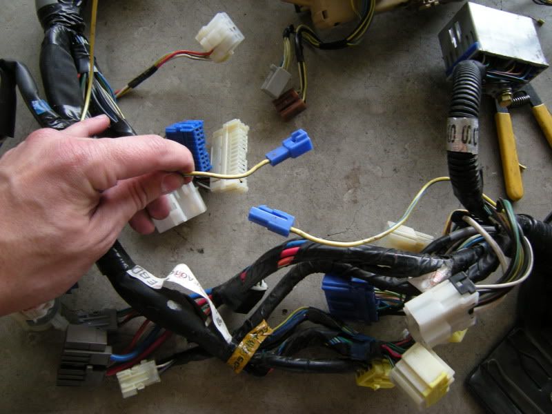 The G/Y wire pictured top left on the plug goes no where at this point. You need to take the sensor ground wire in the last picture and merge it to the ground wire in this picture.