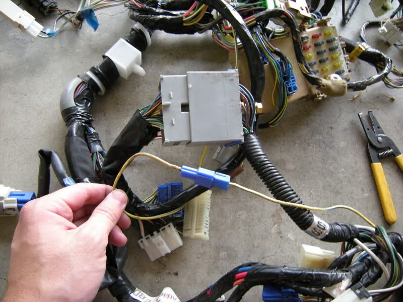 As you continue to pull out the SMJ wires you come to two wires that lead from the SMJ but away from the ECU. These two are the oil pressure light and the water temp gauge. You will solder them into the RS harness later so cut them as long as you can easily now. You don’t need to follow them to there plug just cut them here. This will save you wasting time.